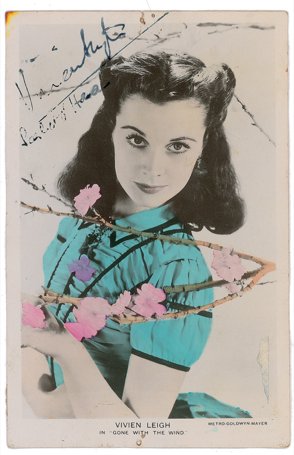 Colorized vintage glossy 3.5 x 5.5 postcard photo, signed in fountain pen, “Vivien Leigh, Scarlett O’Hara.” In very good condition, with tack hole to top and bottom edge, scattered creases and ripples from mounting remnants on reverse, irregular adhesion to both signatures, making the character name somewhat difficult to read, and a small mounting remnant to lower right. This is the first time we have ever seen Leigh add her iconic character’s name to a signed photo. Pre-certified PSA/DNA and RR Auction COA.