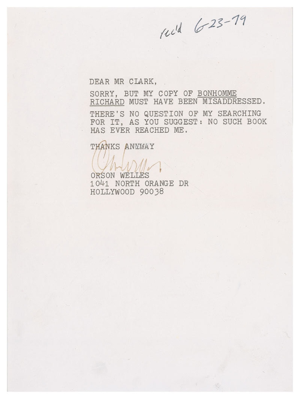 TLS, one page, 5.75 x 8, no date. Brief letter to an admirer. In full: “Sorry, but my copy of Bonhomme Richard must have been misaddressed. There’s no question of my searching for it, as you suggest; no such book ever reached me.” In fine condition, with received notation from 1979 at top, and signature a shade or two light, but still legible. Pre-certified PSA/DNA and RR Auction COA.
