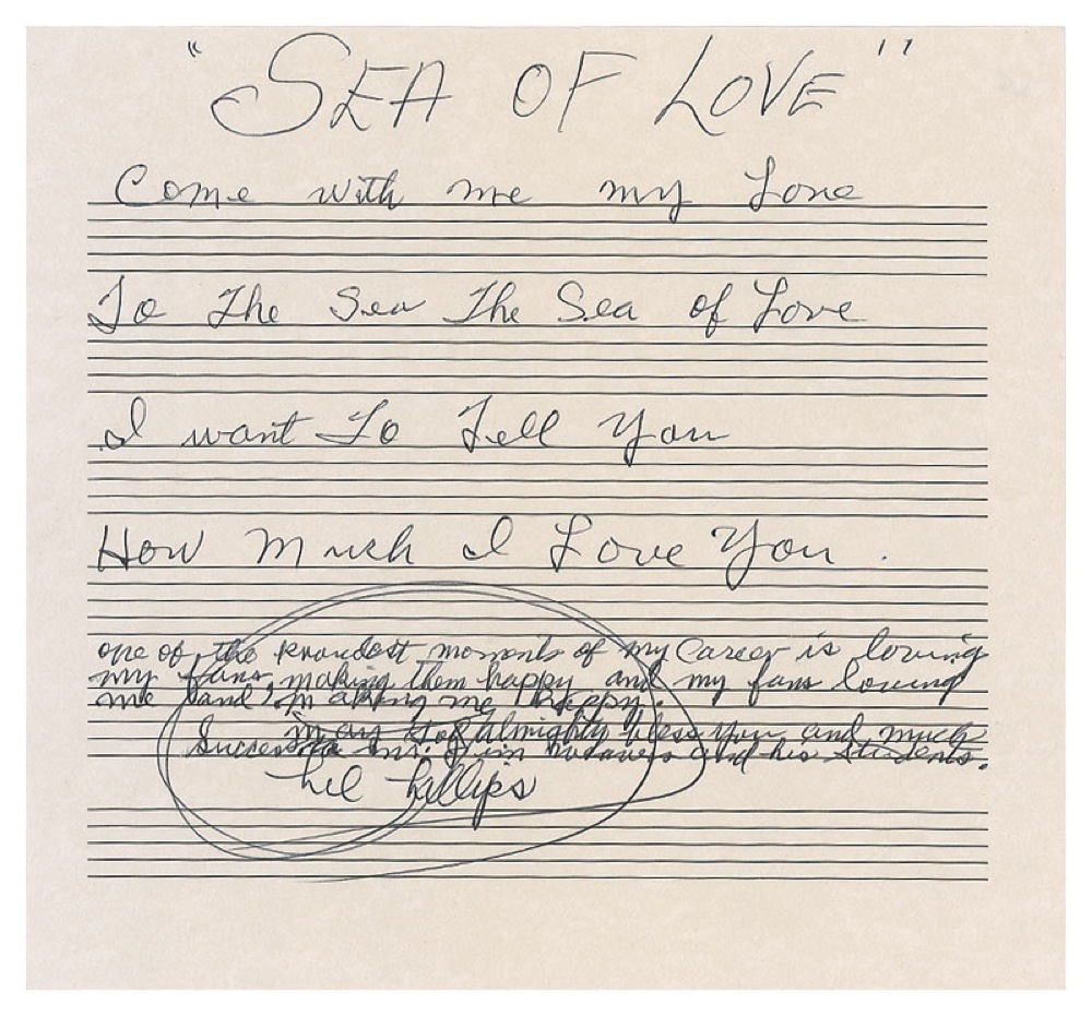 American singer and songwriter best known for his 1959 hit, “Sea of Love.” Souvenir handwritten lyrics on one page of lined music paper, 8.5 x 8. Phillips pens several lines of “Sea of Love.” In part: “Come with me my love to the sea, the sea of love. I want to tell you how much I love you,” adding at the bottom, “One of the proudest moments of my career is loving my fans, making them happy and my fans loving me and making me happy.” In fine condition, with some light surface creasing and a more pronounced diagonal crease, not affecting the signature. RRAuction COA.
