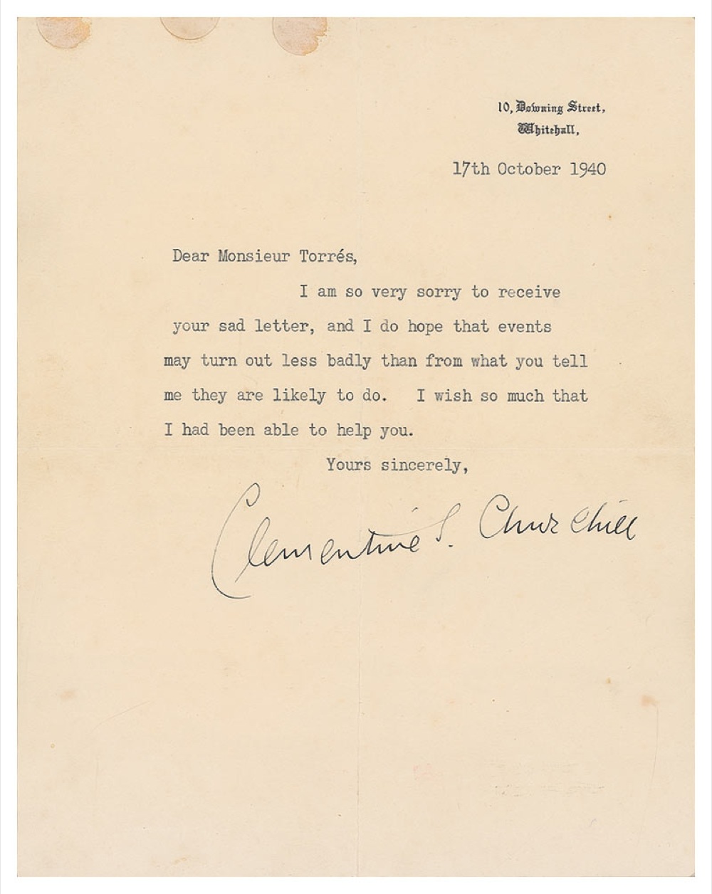 Wife of Winston Churchill (1885–1977). TLS signed “Clementine S. Churchill,” one page, 7.5 x 9.5, 10 Downing Street letterhead, October 17, 1940. Churchill writes to Monsieur Torres, in full: “I am so very sorry to receive your sad letter, and I do hope that events may turn out less badly than from what you tell me they are likely to do. I wish so much that I had been able to help you.” In very good condition, with central horizontal and vertical fold, one passing through a single letter of the signature, uniform toning with a few darker areas, and three circular mounting remnants along the top border. RRAuction COA.
