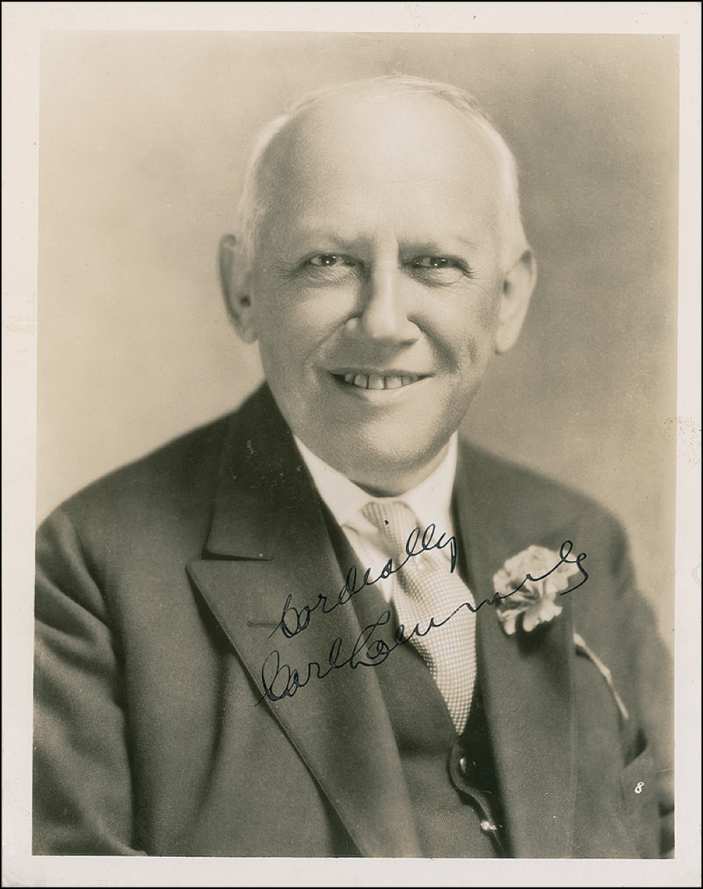 Founder (1867–1939) of Universal Studios and one of the most influential figures in the earliest years of the American film industry. Crisp vintage double-weight glossy 8 x 10 head-and-shoulders photo, signed in fountain pen, “Cordially, Carl Laemmle.” In fine condition, with light corner creasing, some trivial surface dings, and a light spot of silvering. Pre-certified PSA/DNA and RR Auction COA.