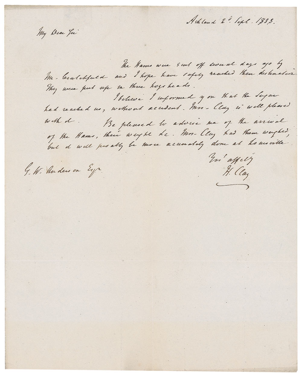 ALS signed “H. Clay,” one page, 8 x 10, September 2, 1838. Clay writes, in part: “The items were sent off several days ago…and I hope have safely reached their destination. They were put up on three hogs heads. I believe I informed you that the sugar had reached us, without accident. Mrs. Clay is well pleased with it. Be pleased to advise me of the arrival of the hams, their weight, etc. Mrs. Clay had them weighted but it will pro ably [sic] be more accurately done at Louisville.” In very good condition, with intersecting folds, one passing through the end of the signature, scattered creasing, and a faint toning along the lower edge. Pre-certified PSA/DNA and RR Auction COA.