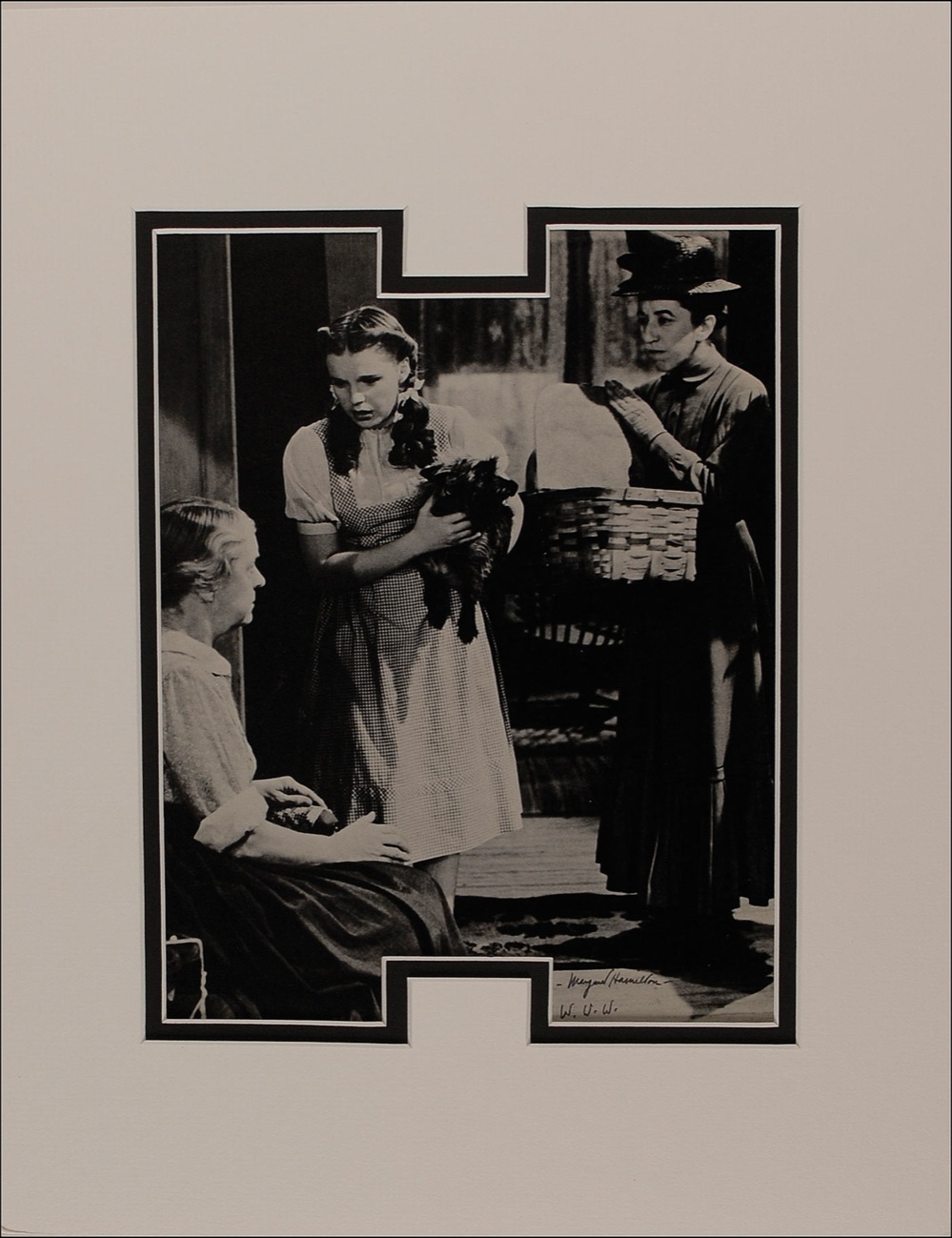 Fantastic 7 x 9 book photo of Dorothy Gale, Auntie Em, and Miss Almira Gulch, signed in fountain pen, “—Margaret Hamilton—W. W. W.” Double-matted to an overall size of 11 x 14, with the inscription matted out. In fine condition. Pre-certified PSA/DNA and RR Auction COA.