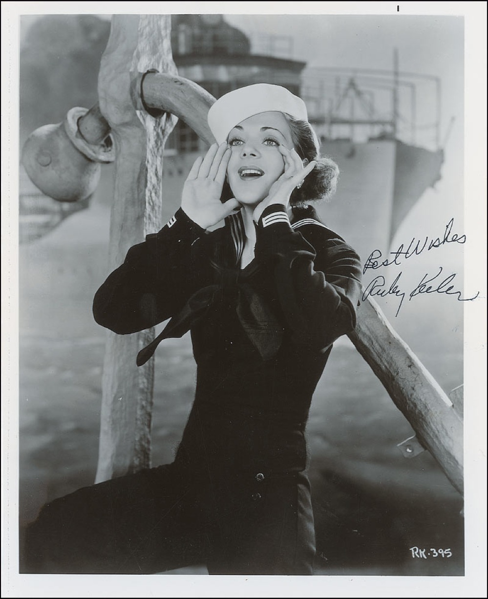 Adorable glossy 8 x 10 photo of Keeler in a sailor suit, signed in black felt tip, “Best Wishes, Ruby Keeler.” In fine condition, with a slight bend along the left edge, and some light feathering to the signature. Pre-certified PSA/DNA and RR Auction COA.