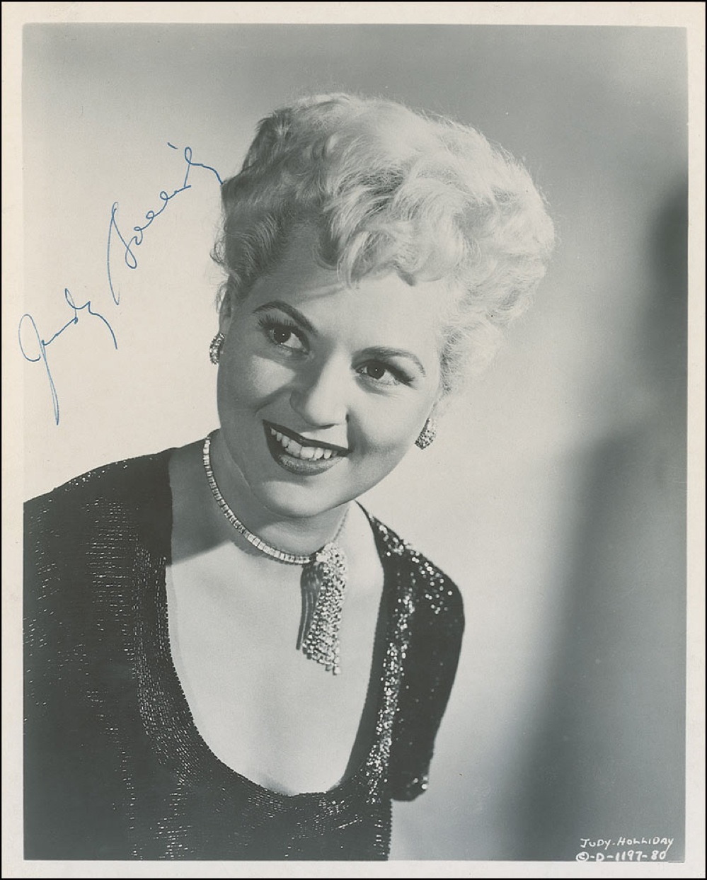 Academy Award winner (1921–1965) for her performance in Born Yesterday, who died of cancer at the age of 43. Pretty glossy 8 x 10 photo, signed in blue ballpoint. In fine condition, with some mild edge rippling and a couple trivial edge and corner dings. Pre-certified PSA/DNA and RR Auction COA.