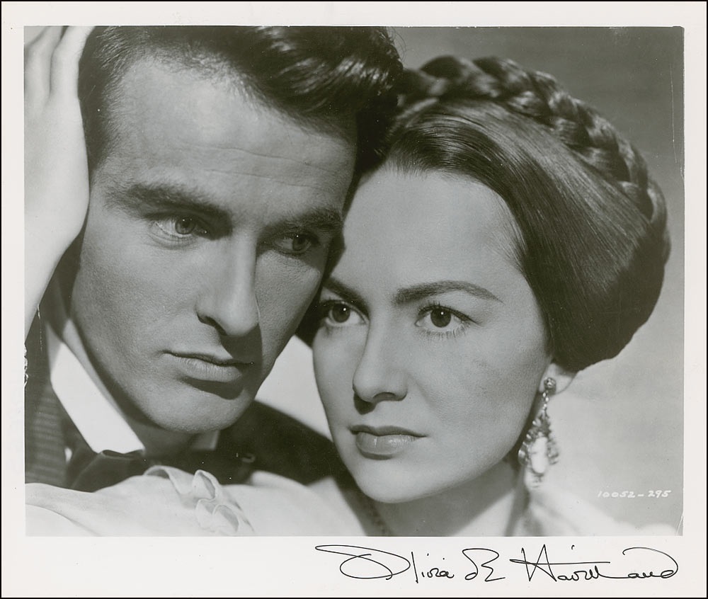 Glossy 10 x 8 photo of de Havilland cheek-to-cheek with Montgomery Clift in The Heiress, signed in the lower border in black felt tip. In fine condition, with a few scattered light surface marks and creases. Pre-certified PSA/DNA and RR Auction COA.