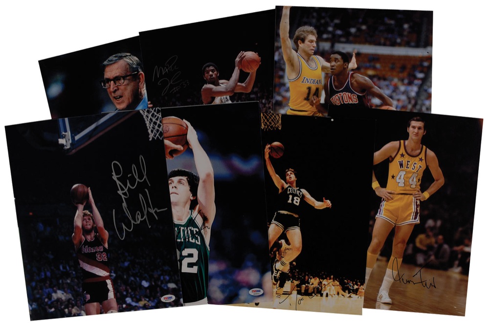 Seven color satin-finish 11 x 14 photos, each signed in silver ink or black felt tip. Signers are: Bill Walton, John Wooden, Kevin McHale, Dave Cowens, Magic Johnson, Isiah Thomas, and Jerry West. In overall fine condition, with a large crease to Wooden’s photo. A PSA/DNA authentication label is affixed to each lower corner and each is accompanied by a certificate of authenticity from PSA/DNA, with the exception of Cowen’s photo. RRAuction COA.