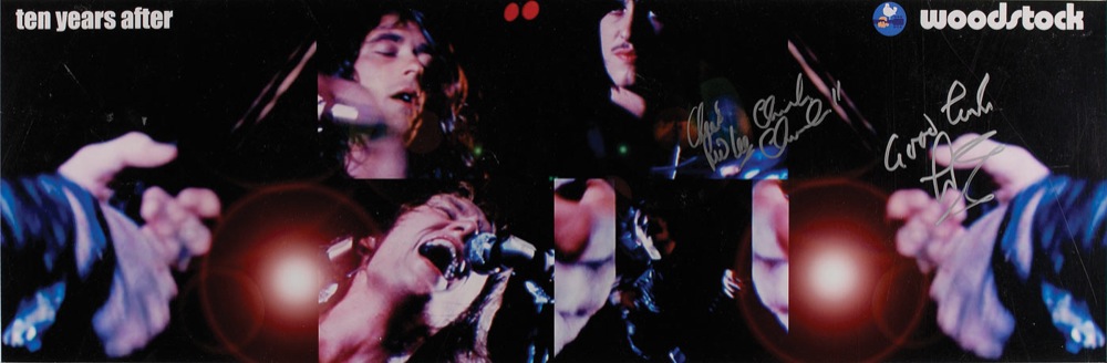 Color 30 x 10 composite photo of the band performing at Woodstock, signed in silver ink by Leo Lyons, Ric Lee, and Chick Churchill. In fine condition, with some scattered light surface marks. RRAuction COA.