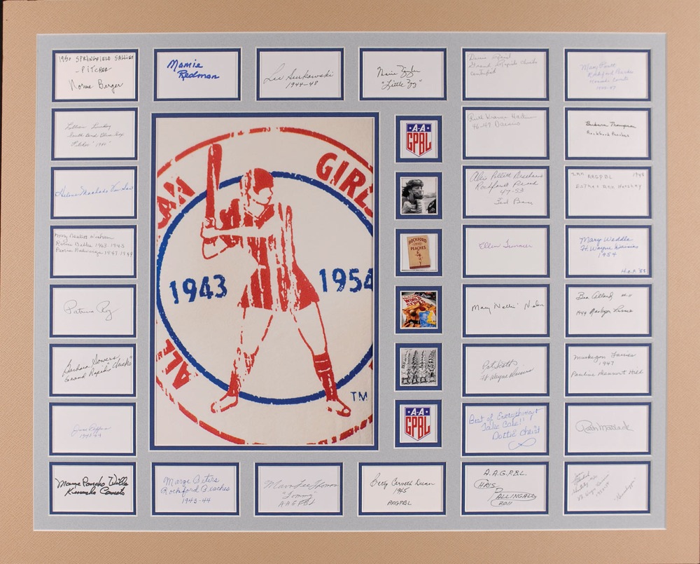 Ink and felt tip signatures of 31 former members of the AAGPBL on individual white cards. Signers are: Norma Berger, Lillian Luckey, Helene Machado Van Sant, Mary Nesbitt Wisham, Patricia Roy, Barbara Powers, June Peppas, Marge Poncho Villa, Marge Peters, Mava Lee Thomas, Betty Carveth Dunn, Chris Pallingall, Jean Havlish, Ruth Mattack, Dottie Christ, Mary Nelson, Bea Allard, Ellen Tronnier, Mary Weddle, Alice Deschaire, Ruth Hartman, Barbara Thompson, Dorrie Reid, Mary Pratt, Marie Ziegler, Lee Surkowski, and Mamie Redman. All are triple matted with a photo of the logo and six smaller images, to an overall size of 30 x 24. In fine condition. Oversized. RRAuction COA.
