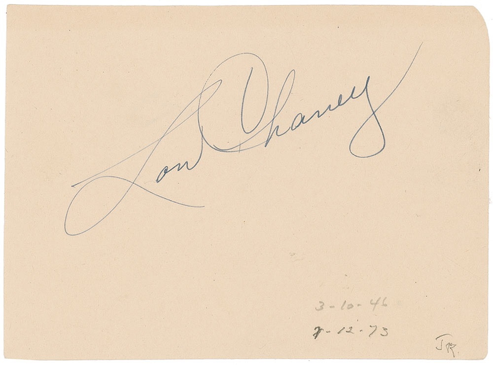 Florid vintage fountain pen signature, “Lon Chaney,” on an off-white 5.5 x 4 album page. In fine condition, with a few trivial creases and some pencil notations towards the bottom border. Accompanied by an unsigned photo of Chaney as the Wolf Man. Pre-certified PSA/DNA and RR Auction COA.