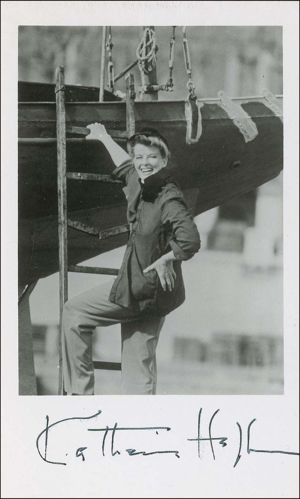 Scarce and excellent semi-glossy 3.5 x 6 cardstock photo of Hepburn climbing down ladder of a ship, signed in the bottom border in black felt tip. In fine condition, with some light feathering and a bit of light smudging to the signature. Pre-certified PSA/DNA and RR Auction COA.