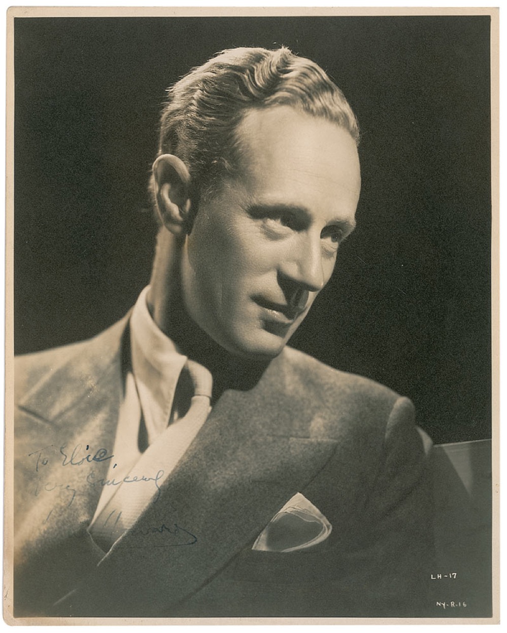 Distinguished vintage matte-finish 8 x 10 head-and-shoulders profile photo, signed and inscribed in fountain pen, “To Elois, Very Sincerely, Leslie Howard.” The first name of the signature is light, and poor contrast to the remainder of the signature against the dark background, otherwise fine condition. Pre-certified PSA/DNA and RR Auction COA.