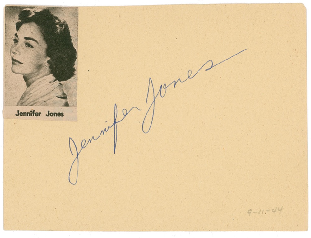 Beautiful vintage fountain pen signature, “Jennifer Jones,” on a yellow 5.5 x 4 album page with a clipped photo of Jones affixed to the top left corner. In fine condition, with a small pencil notation towards the bottom right corner. Pre-certified PSA/DNA and RR Auction COA.
