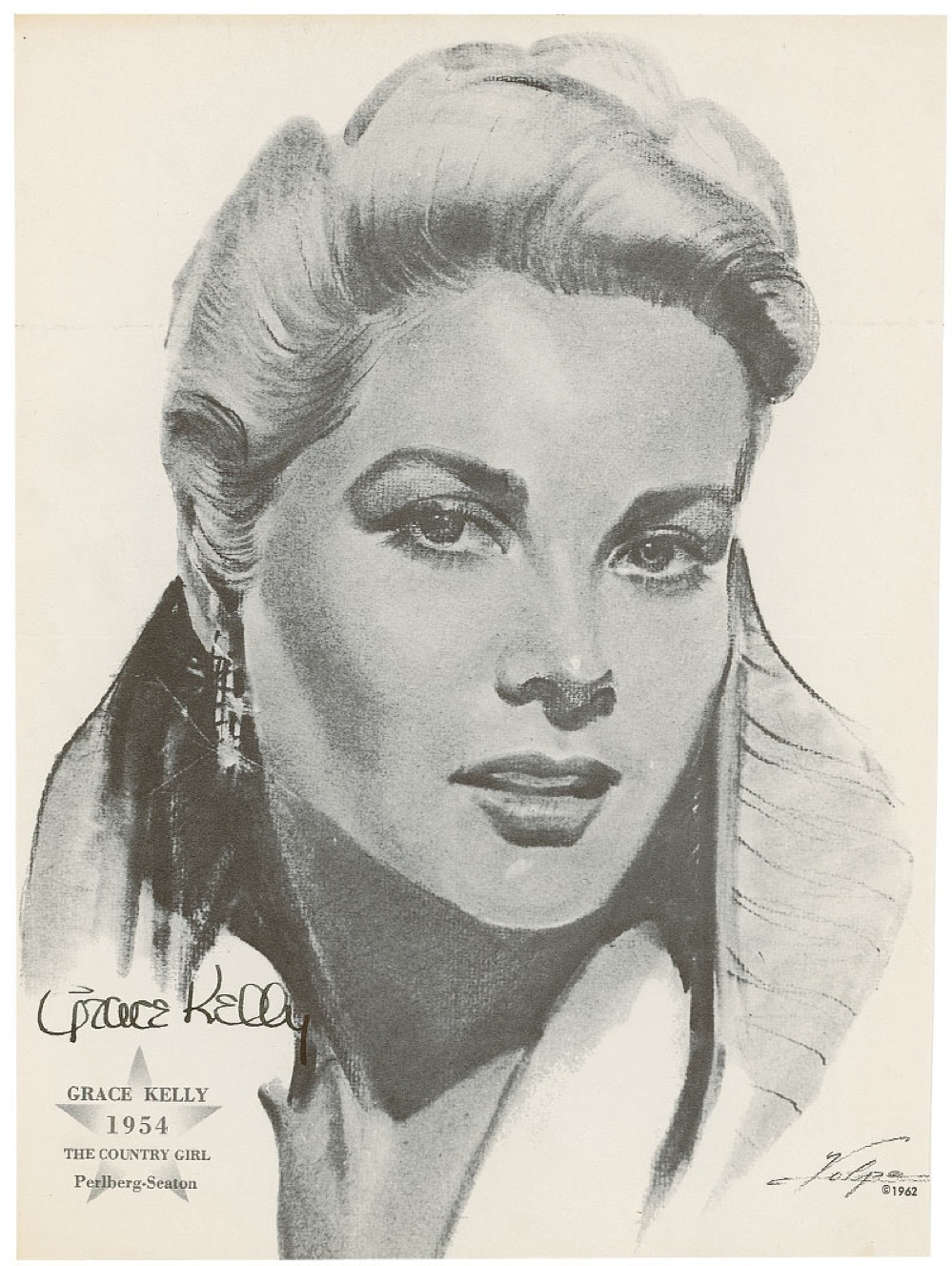 Glamorous Volpe print, 7.75 x 10.5, featuring Grace Kelly from her 1954 film, The Country Girl, signed in fountain pen. In very good condition, with three horizontal mailing folds. Pre-certified PSA/DNA and RR Auction COA.