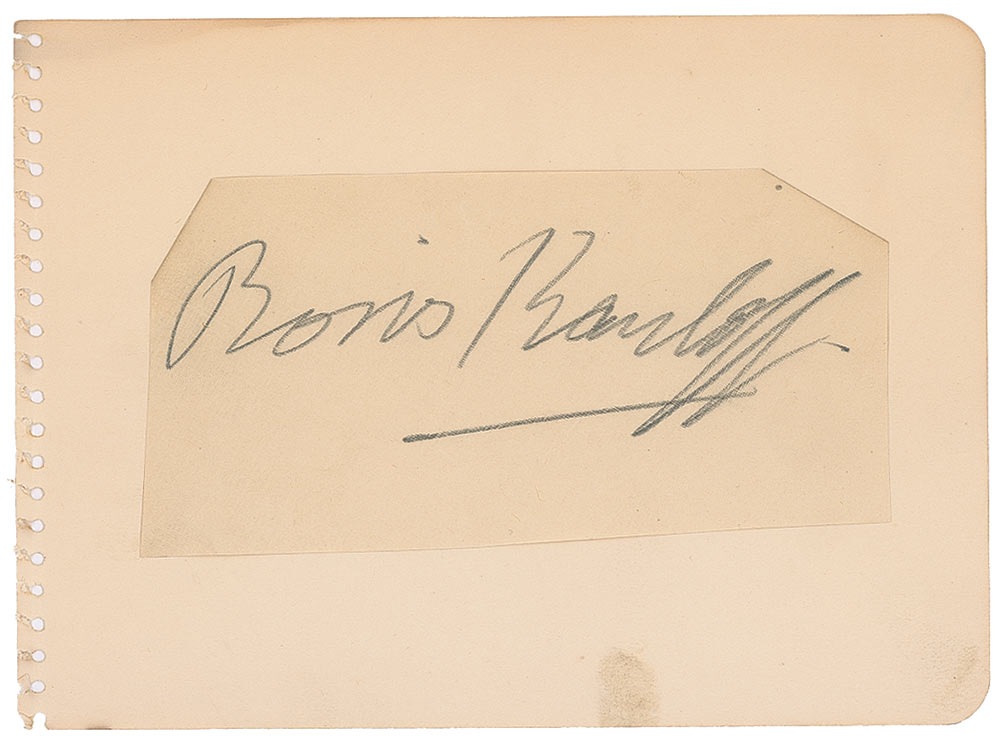 Nice vintage pencil signature, “Boris Karloff,” on an off-white 4.5 x 2.25 irregularly trimmed sheet, affixed to a slightly larger album page. In fine condition, with light toning. Pre-certified PSA/DNA and RR Auction COA.