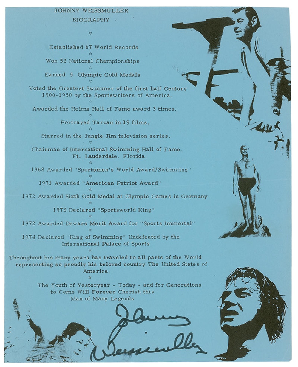 Souvenir biography timeline of Weissmuller’s achievements, 8 x 10, signed at the conclusion in black felt tip, “Johnny Weissmuller.” A horizontal crease, trimmed edges, and some mild smudging to two letters of the last name, otherwise fine condition. Pre-certified PSA/DNA and RR Auction COA.