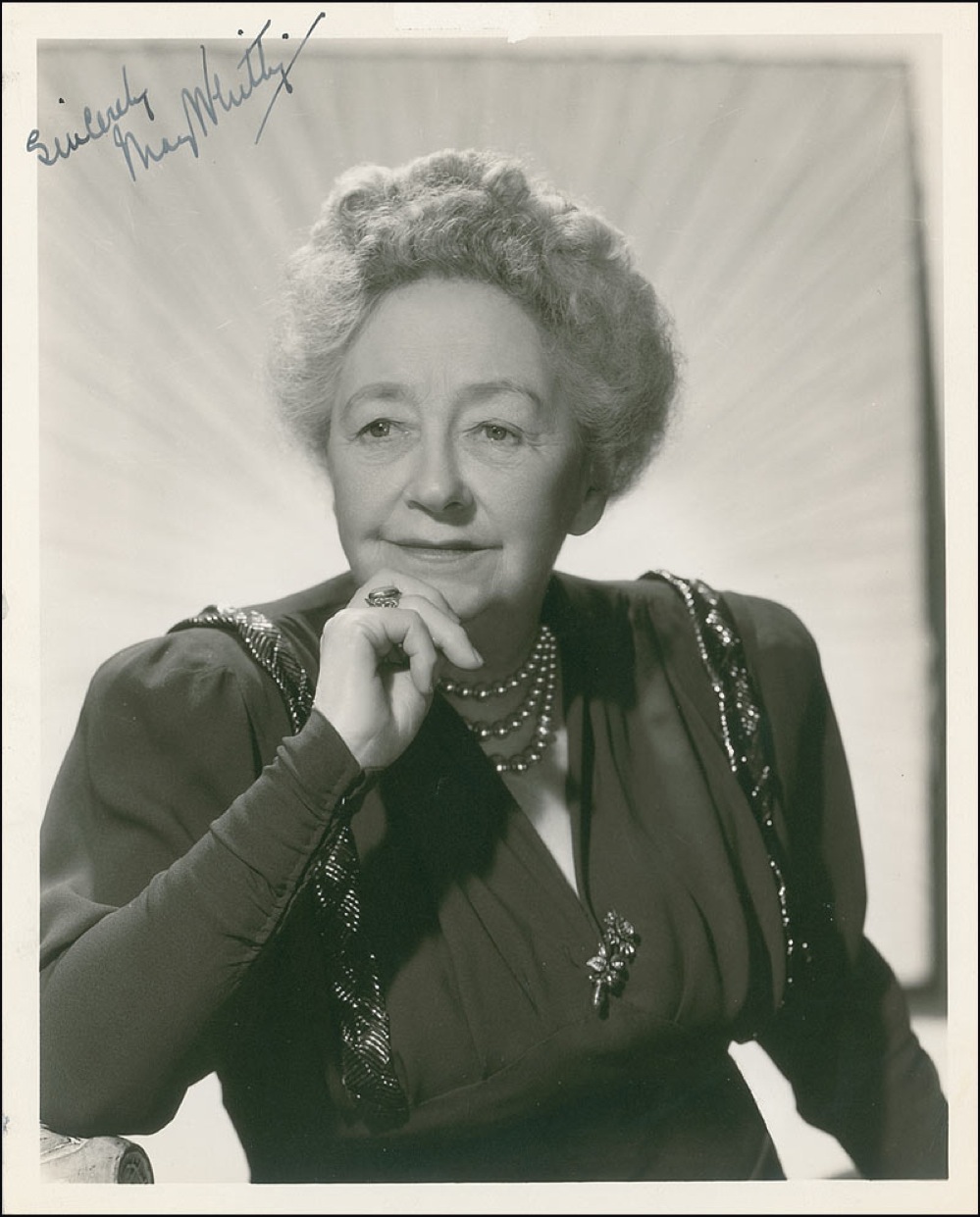 Classy vintage matte-finish 8 x 10 head-and-shoulders photo, signed in fountain pen, “Sincerely, May Whitty.” In fine condition, with light corner creases and a spot of trivial surface loss at the top edge. Pre-certified PSA/DNA and RR Auction COA.