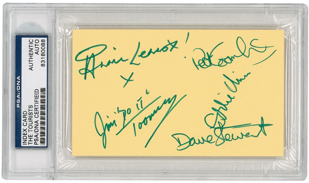 Felt tip signature Annie Lennox, Dave Stewart, Peet Coombes, Jim Toomey, and Eddie Chin on a yellow 5 x 3 card. Encapsulated in a plastic PSA/DNA authentication holder. In fine condition. RRAuction COA.