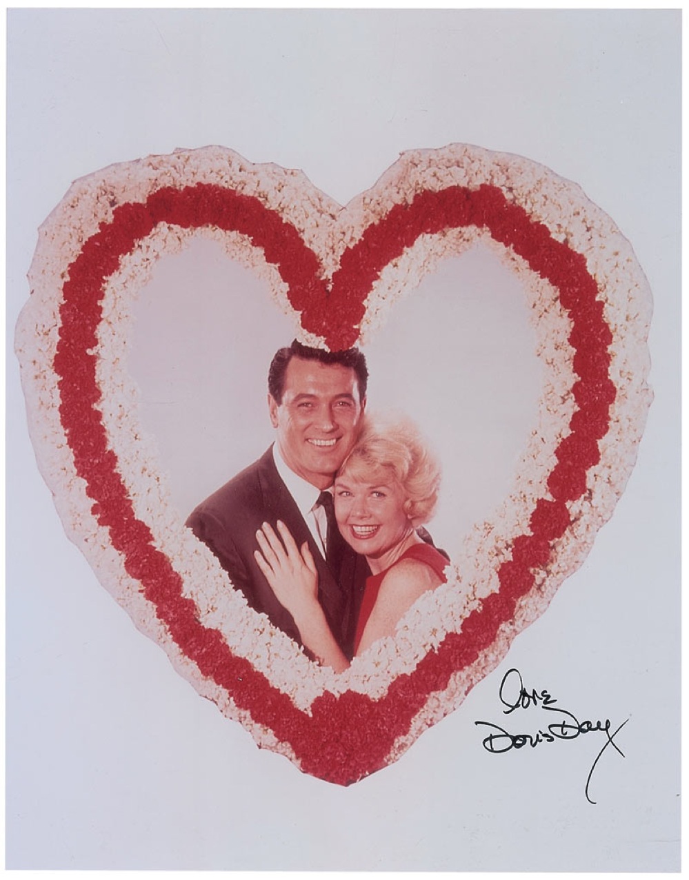 Color glossy 11 x 14 photo of Day and Rock Hudson, framed in an oversized flowered heart wreath, signed in black felt tip, “love, Doris Day.” In fine condition, with some trivial spotting and rubbing. Pre-certified PSA/DNA and RR Auction COA.