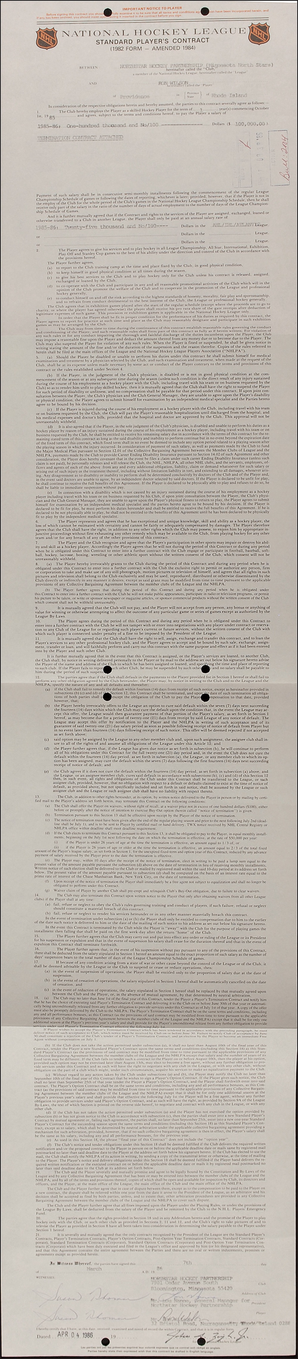 Wilson played in the NHL for 11 years and also served as head coach for the 2010 US Men’s Olympic hockey team. Nanne was a former defensmen who was integral in getting Herb Brooks appointed coach of the 1980 Men’s Olympic hockey team. DS, one page both sides, 8.5 x 39.5, April 4, 1986. Standard NHL Player’s contract between Wilson and the Minnesota North Stars for a one-year contract for Wilson to play at a salary of $100,000. Signed at the bottom by Wilson and Minnesota General Manager Lou Nanne. In fine condition, with two punch holes to top and expected folds and stamps. Accompanied by a player’s termination contract, also signed by Wilson and Nanne. Pre-certified Steve Grad/PSA/DNA and RR Auction COA.