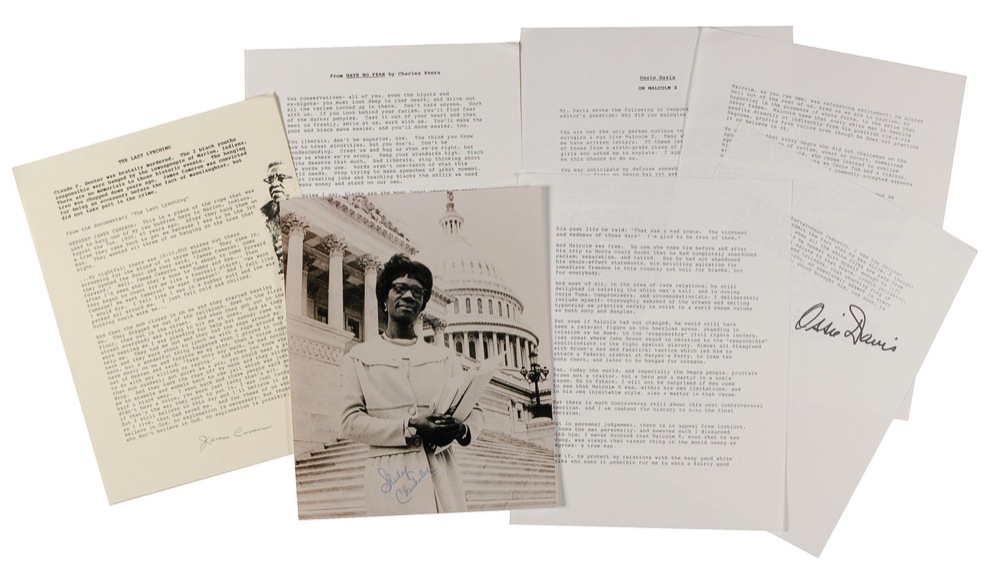 Four items: three souvenir TQSs on separate 8.5 x 11 pages, each signed at the conclusion in felt tip or pencil by the respective author. Signers are: Ossie Davis (On Malcolm X), Charles Evers (Have No Fear), and James Cameron (The Last Lynching); and a glossy 8 x 10 photo of Shirley Chisholm standing on the steps of the capital, signed in blue ballpoint. In fine condition, with some light corner creasing to the typescripts and a bit of a grainy appearance to the photo. RRAuction COA.