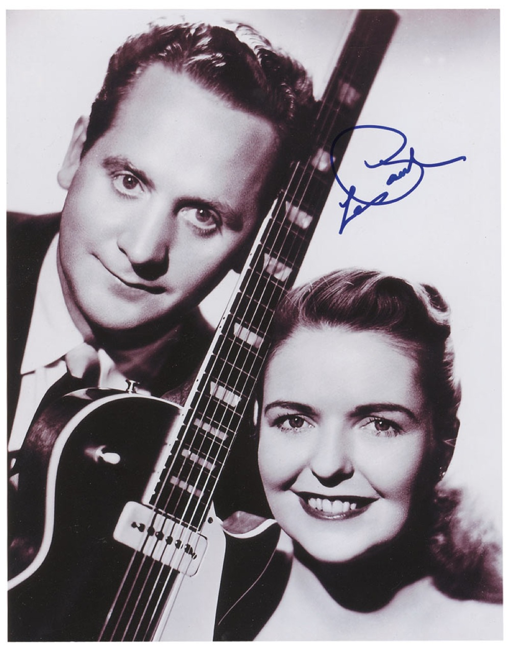 Two satin-finish 11 x 14 photos: one of Les Paul and Mary Ford, signed in blue felt tip; and a color photo of Paul and his guitar, signed in gold ink. In fine condition. RRAuction COA.
