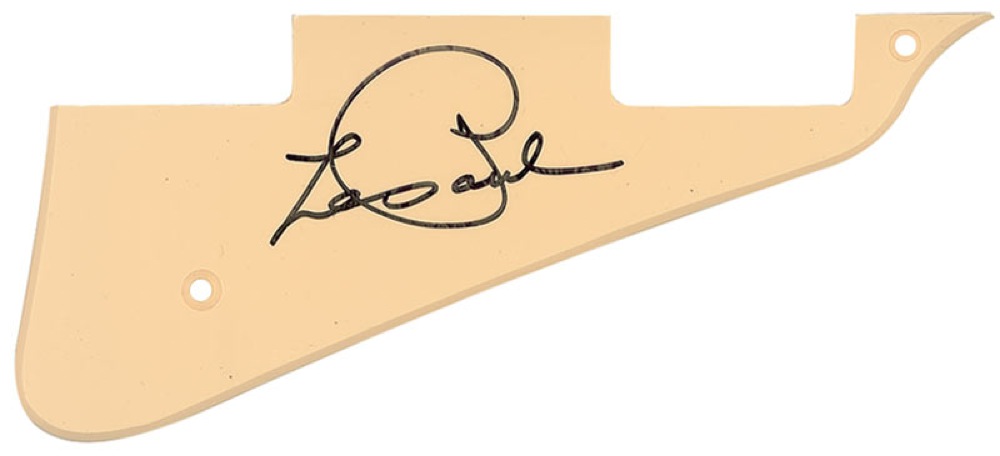 Two items: satin-finish 11 x 14 photo of Les Paul with his guitars, signed in gold ink; and an ivory-colored pickguard for a ‘Les Paul-style’ guitar, signed in black felt tip. In fine condition. RRAuction COA.