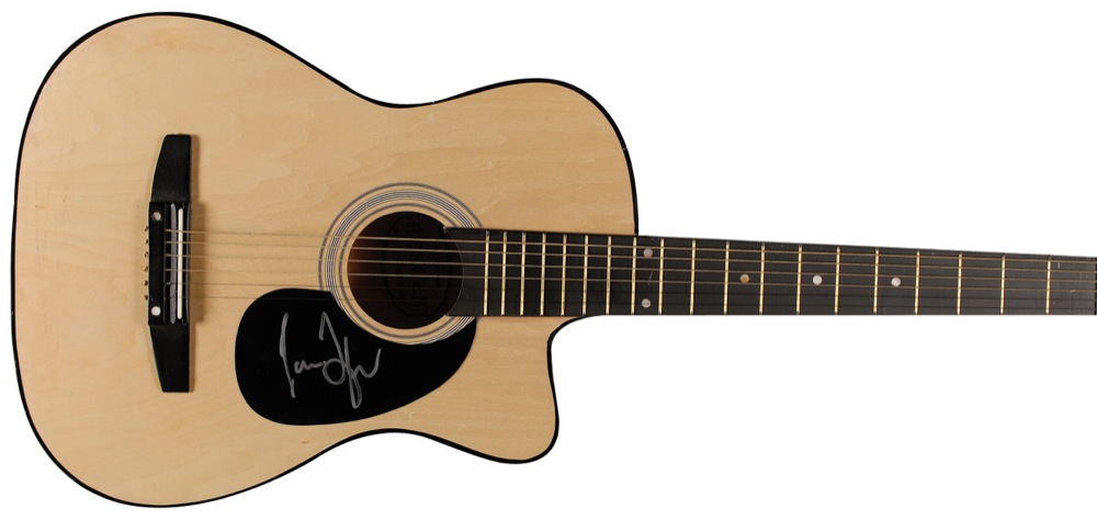 Natural wood-finish Crescent six-string acoustic guitar, signed on the pickguard in silver ink. In fine condition, with some light surface marks to pickguard and some old felt tip marks to body. Oversized. RRAuction COA.