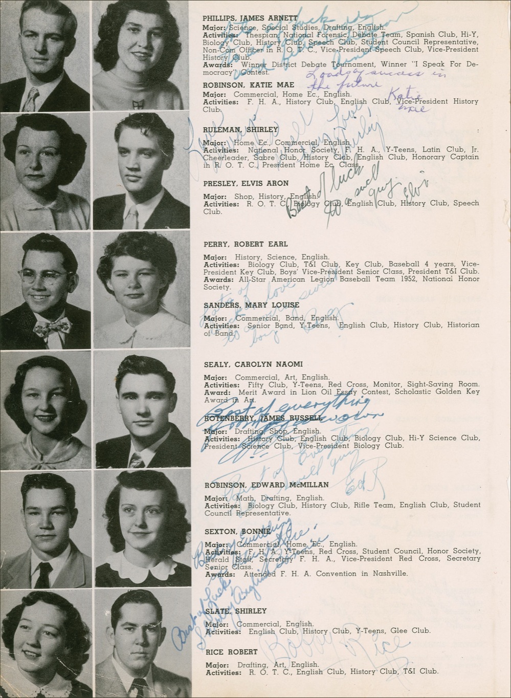The Humes High School (Memphis) annual for the graduating class of 1953, the Senior Herald, hardcover, 112 pages, 8 x 11, signed in fountain pen near his senior portrait, “Best of luck to a swell guy, Elvis.” The caption below his portrait indicates that Elvis majored in Shop, History and English, and that he was a member of the ROTC, Biology Club, English Club, History Club and Speech Club. Another section of the yearbook includes the “Last Will and Testament” of each student. One paragraph reads: “Donald Williams, Raymond McCraig and Elvis Presley leave hoping there will be someone to take their places as ‘teacher’s pets.’ ???????” The remainder of the interior, including the page signed by Elvis, bears numerous other students’ signatures. In good to very good condition, with all pages separated from binding, scattered creasing and soiling to pages, a couple pages possibly missing, surface loss to front pastedown, weak hinges, and scattered wear to covers and spine. Accompanied by a letter of authenticity from James Spence. Autograph material from this early, pre-fame period of Elvis’ life is of the greatest scarcity. Pre-certified Roger Epperson/REAL and RR Auction COA.
