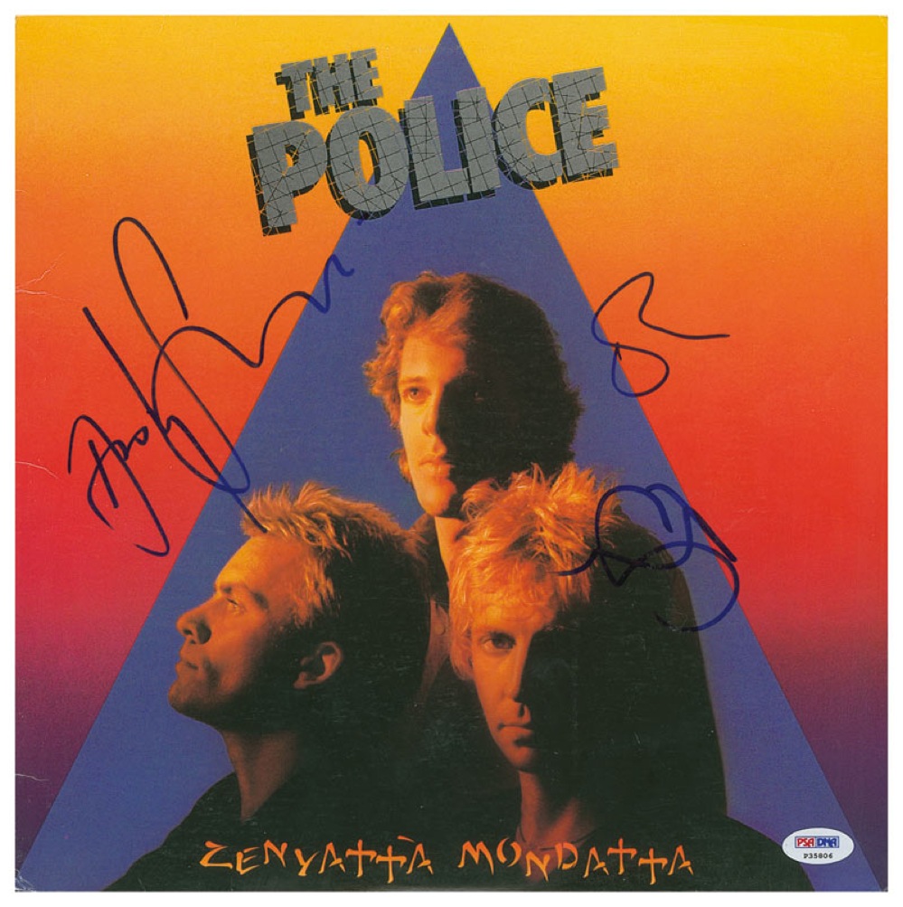 Zenyatta Mondatta album signed on the front in blue felt tip by Sting, Stewart Copeland, and Andy Summers. In fine condition, with a PSA/DNA authentication label affixed to the bottom right corner. The record is included. RRAuction COA.