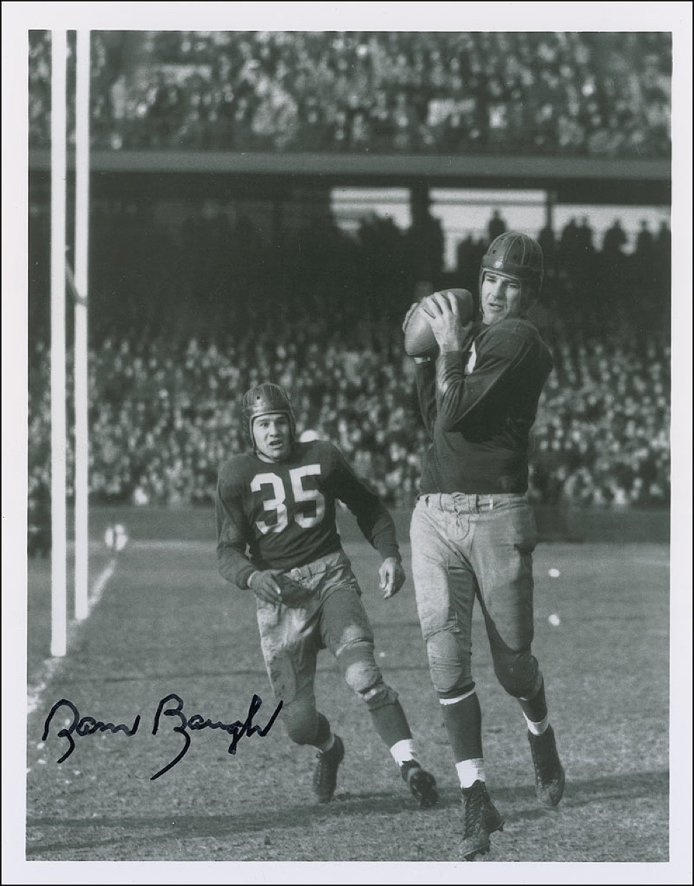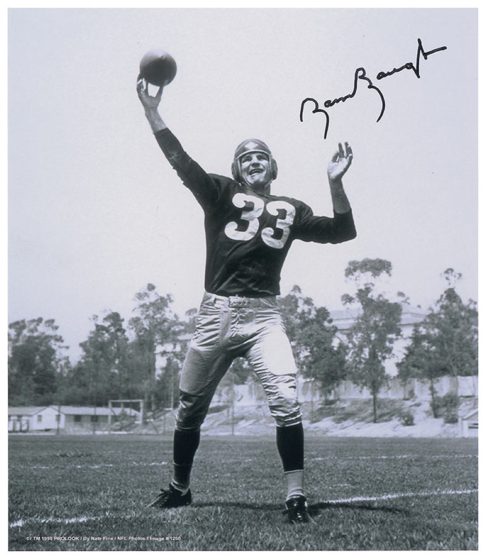 Two different glossy 8 x 10 photos, each featuring Baugh making plays on the field, and each signed in black felt tip. In fine condition. Pre-certified Steve Grad/PSA/DNA and RR Auction COA.