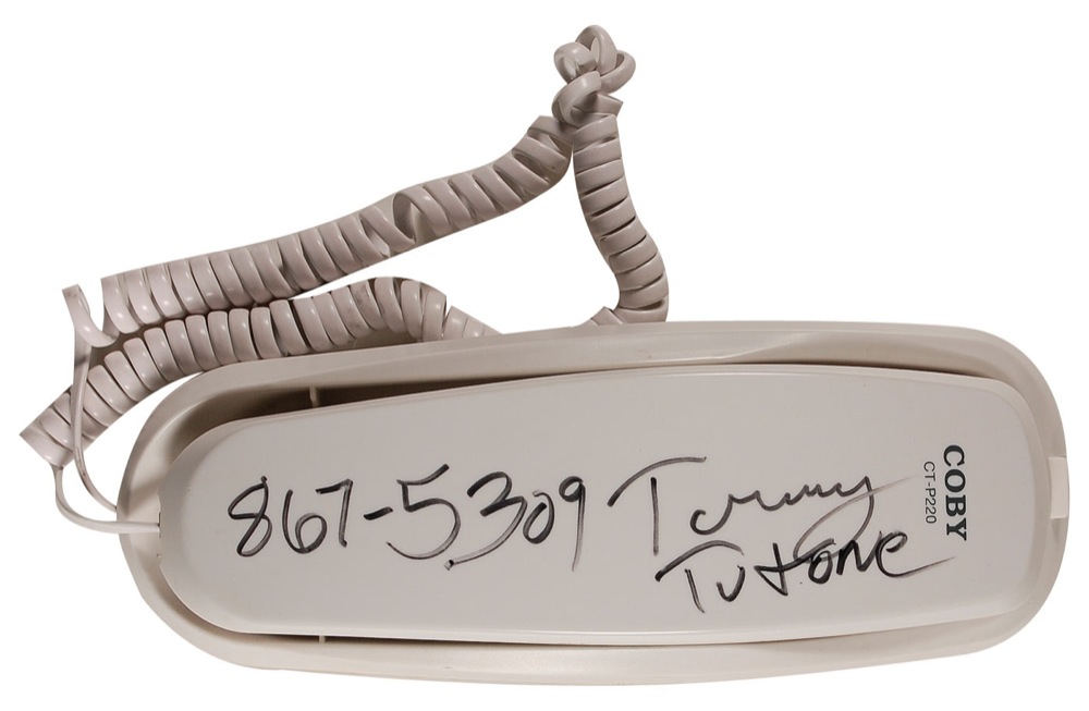 White Coby push-button phone, signed on the handset in black felt tip, “867–5309, Tommy Tutone.” In fine condition, with some light wear and soiling. RRAuction COA.