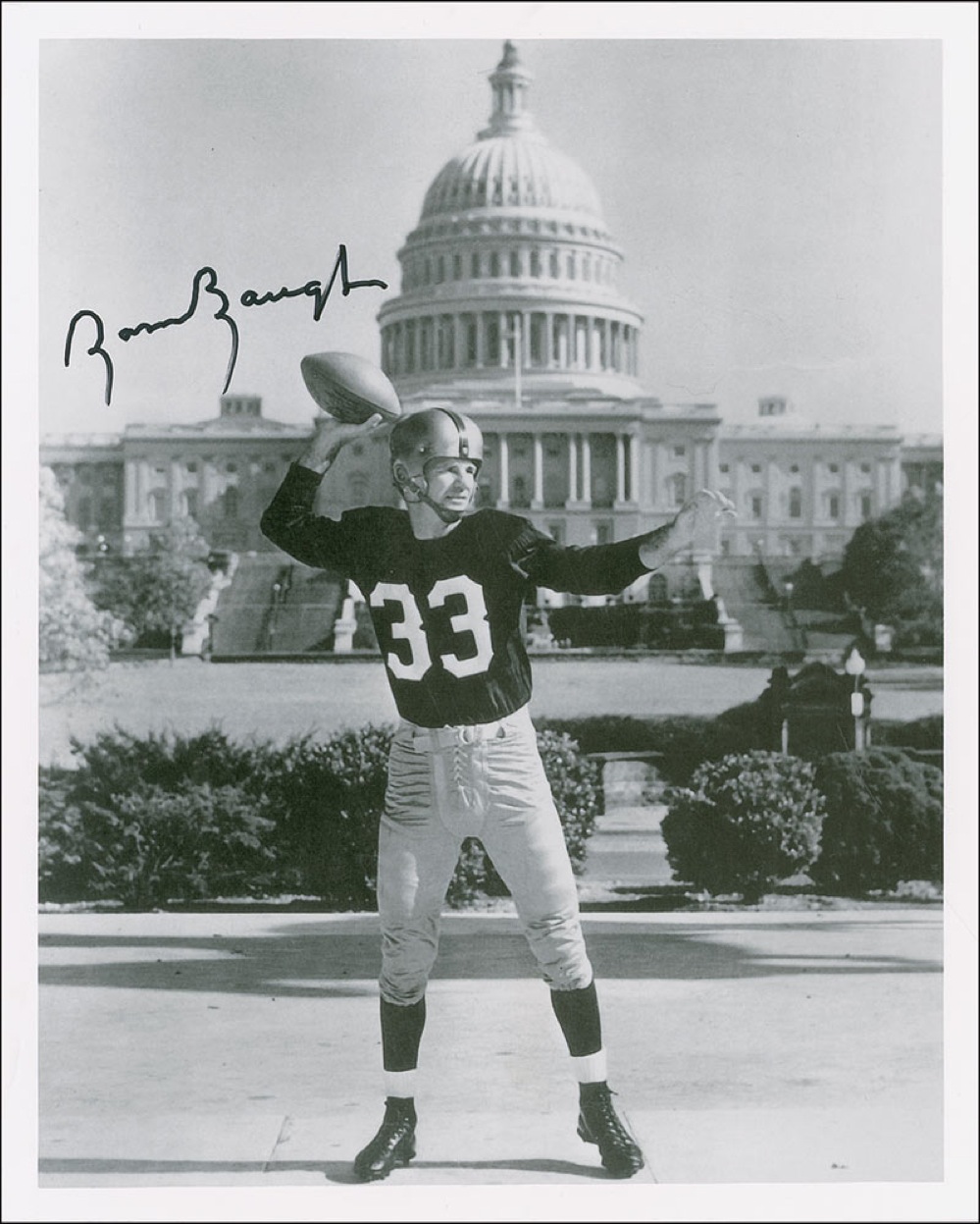 Cardstock 8 x 10 photo of Baugh, in his uniform, posing in front of the Capitol building, signed in black felt tip. In fine condition. Pre-certified Steve Grad/PSA/DNA and RR Auction COA.