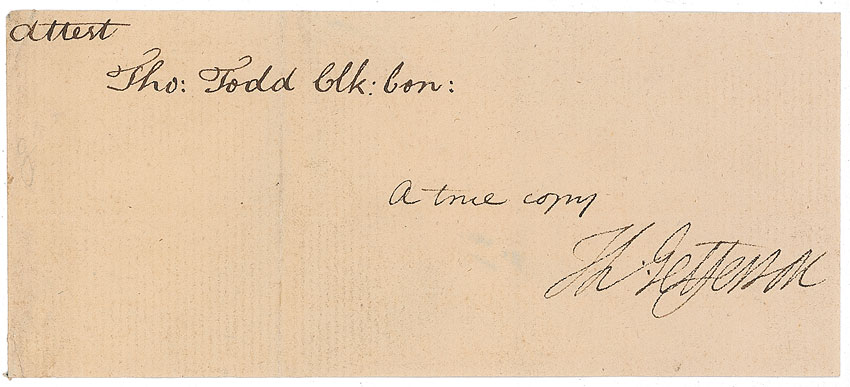 Crisp ink signature, “A true copy. Th: Jefferson,” on an off-white 5.25 x 2.25 slip, clipped from a larger letter or document, with several additional words in an unknown hand. In fine condition, with a vertical fold to left side and a mild shade of overall toning. Pre-certified John Reznikoff/PSA/DNA and RR Auction COA.