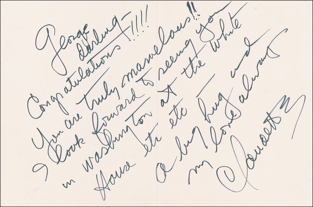 Greeting card, 9 x 6 unfolded, featuring the Thomas Gainsborough painting, ‘Sarah, Lady Innes,’ on the cover. Colbert writes a note to George Burns across both blank pages, “George darling—Congratulations!!! You are truly marvelous!! I look forward to seeing you in Washington at the White House etc etc.” In fine condition. Pre-certified PSA/DNA and RR Auction COA.