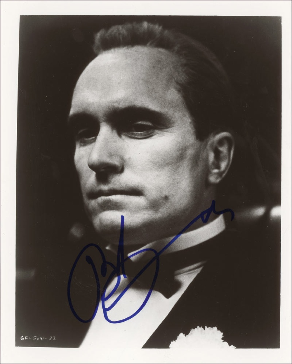 Glossy 8 x 10 photo of Duvall as Tom Hagen from The Godfather, signed in-person in blue felt tip. In fine condition, with some light contrast to signature. Pre-certified PSA/DNA and RR Auction COA.