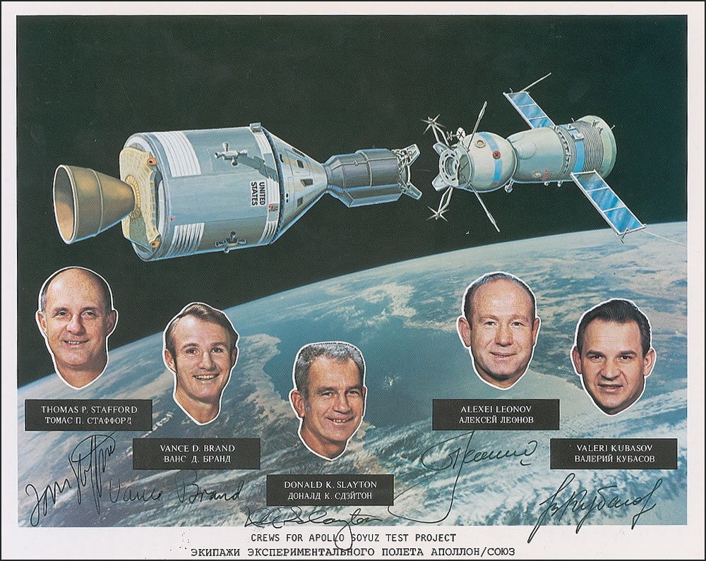 Color 10 x 8 NASA composite photo of an artist’s rendering of the Apollo-Soyuz Test Project in space and their crews, signed in black felt tip by Deke Slayton, Vance Brand, Tom Stafford, Alexei Leonov, and Valeri Kubasov. In fine condition. Provenance: The Deke Slayton Family Collection. Pre-certified Steve Zarelli and RR Auction COA.