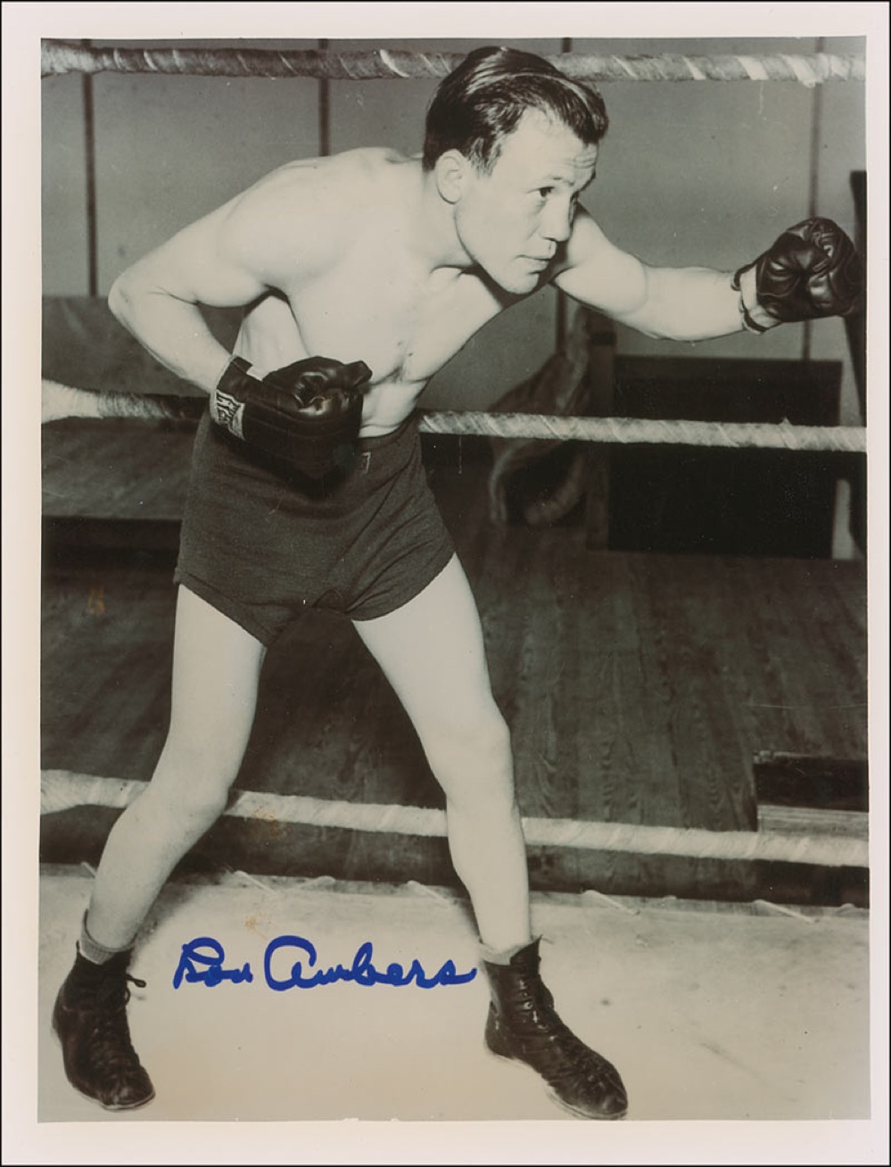 Former lightweight champion of the world. Glossy 8 x 10 photo of Ambers posing in his boxing gear, signed in blue felt tip. In fine condition. Accompanied by a certificate of authenticity from Jim Stinson. Pre-certified Steve Grad/PSA/DNA and RR Auction COA.