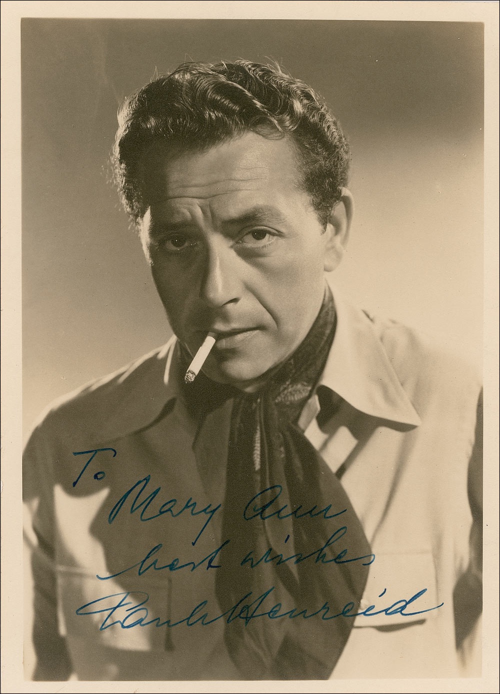 Vintage matte-finish 5 x 7 photo of Henreid with a cigarette casually dangling from his lips, signed and inscribed in fountain pen, “To Mary Ann, best wishes, Paul Henreid.” In fine condition. Pre-certified PSA/DNA and RR Auction COA.