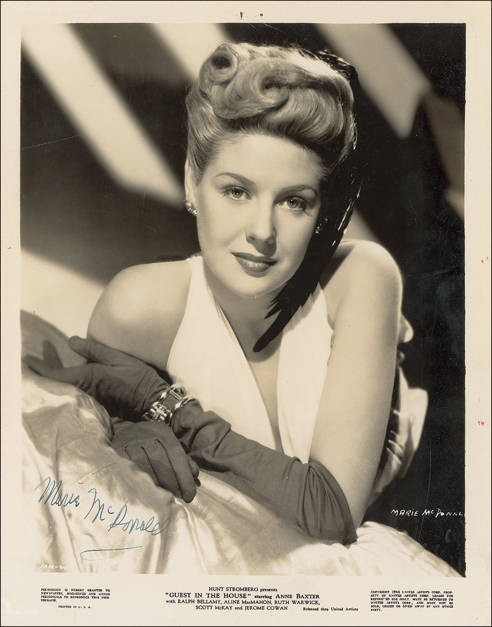 Glamorous glossy 8 x 10 promotional photo for Guest in the House, signed in fountain pen, “Marie McDonald.” In very good condition, with scattered creases, dings, and marks, a small tear to the bottom right corner, and silvering to some of the darker areas of the image. Pre-certified PSA/DNA and RR Auction COA.