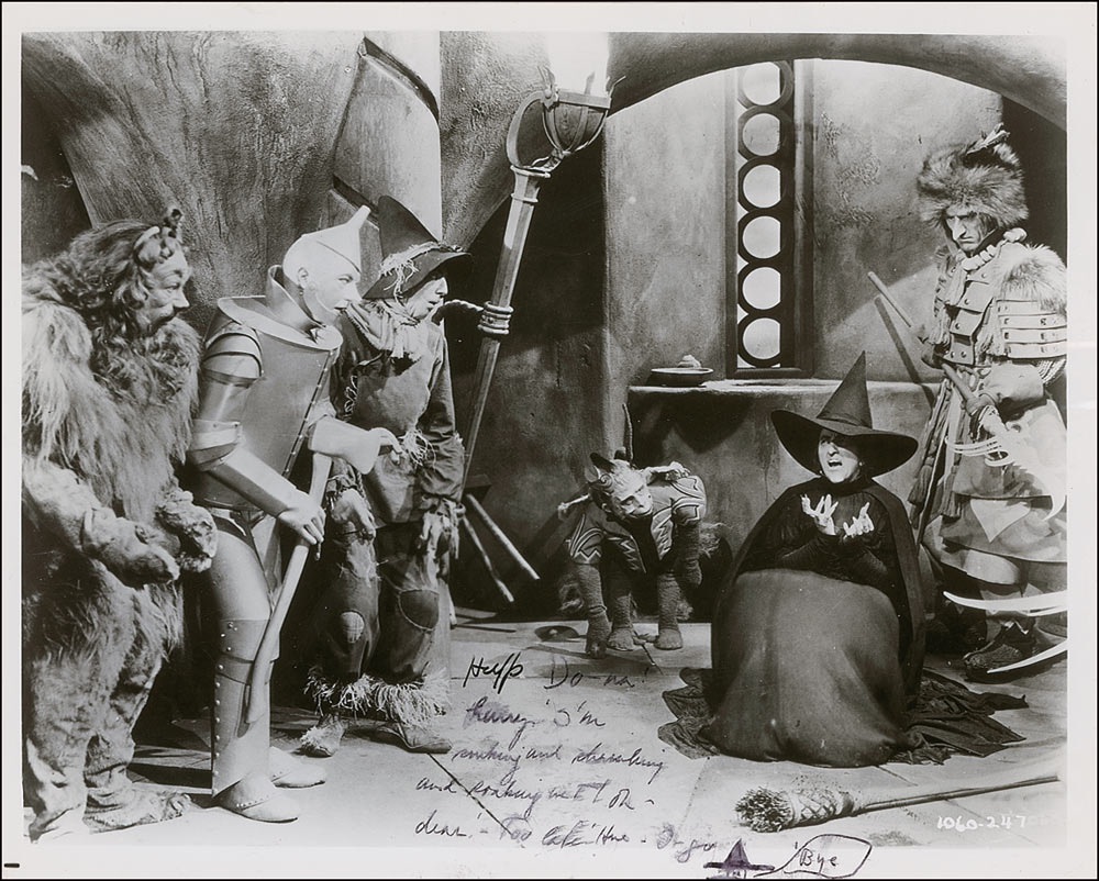 Glossy 10 x 8 photo of the demise of the Wicked Witch of the West, signed and inscribed in black felt tip “Help Do–na. Hurry I’m sinking and shrinking and soaking wet! Oh dear. Too late! Here—I—go,” signing with a little sketch of a mostly-melted witch saying “Bye.” In very good condition, with several brushes to inscription, scattered bends and creases, and light edge rippling. Pre-certified PSA/DNA and RR Auction COA.