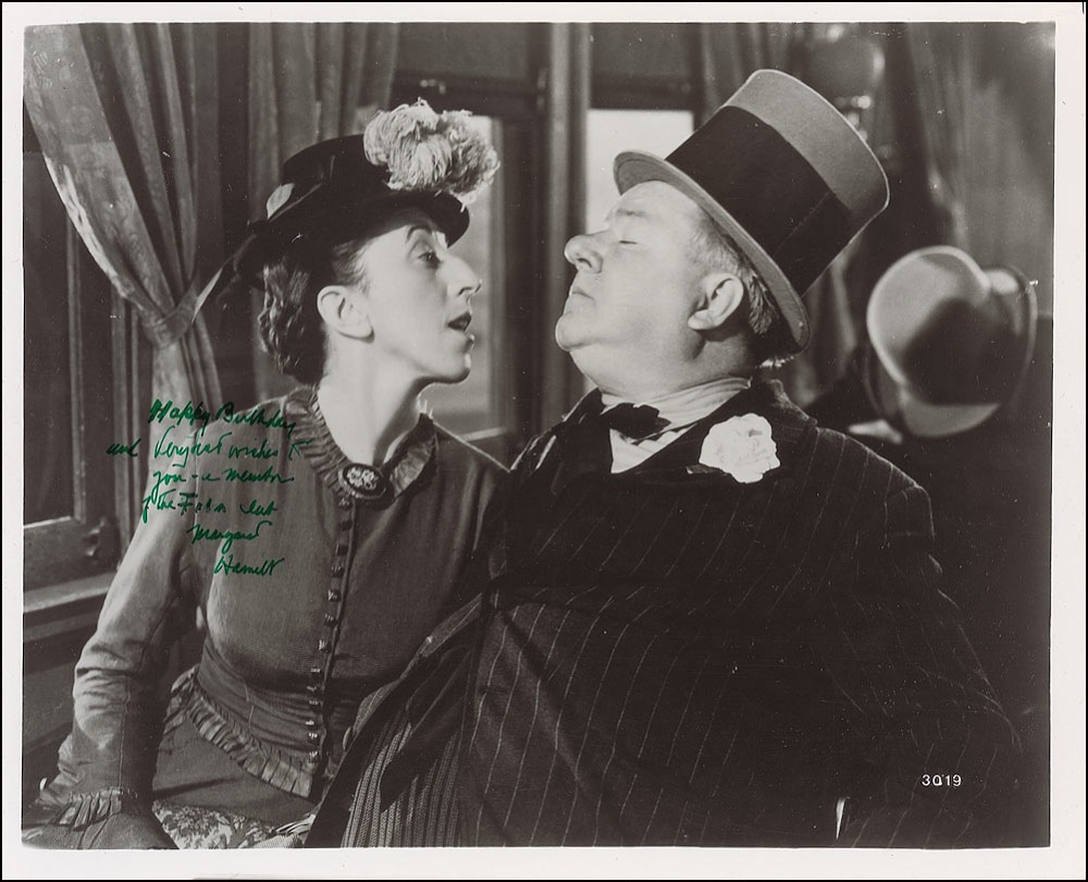 Glossy 10 x 8 photo of Hamilton and W. C. Fields in My Little Chickadee, signed in green ink, “Happy birthday and very best wishes to you—a member of the Film Club. Margaret Hamilton.” In fine condition, with scattered light surface marks and creases. Pre-certified PSA/DNA and RR Auction COA.