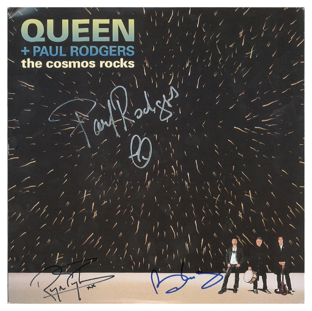 The Cosmos Rocks album signed on the front cover in blue felt tip by Brian May, in black felt tip by Roger Taylor, and in silver ink by Paul Rogers. In fine condition, with a few light surface creases. The record is included. Pre-certified Roger Epperson/REAL and RR Auction COA.
