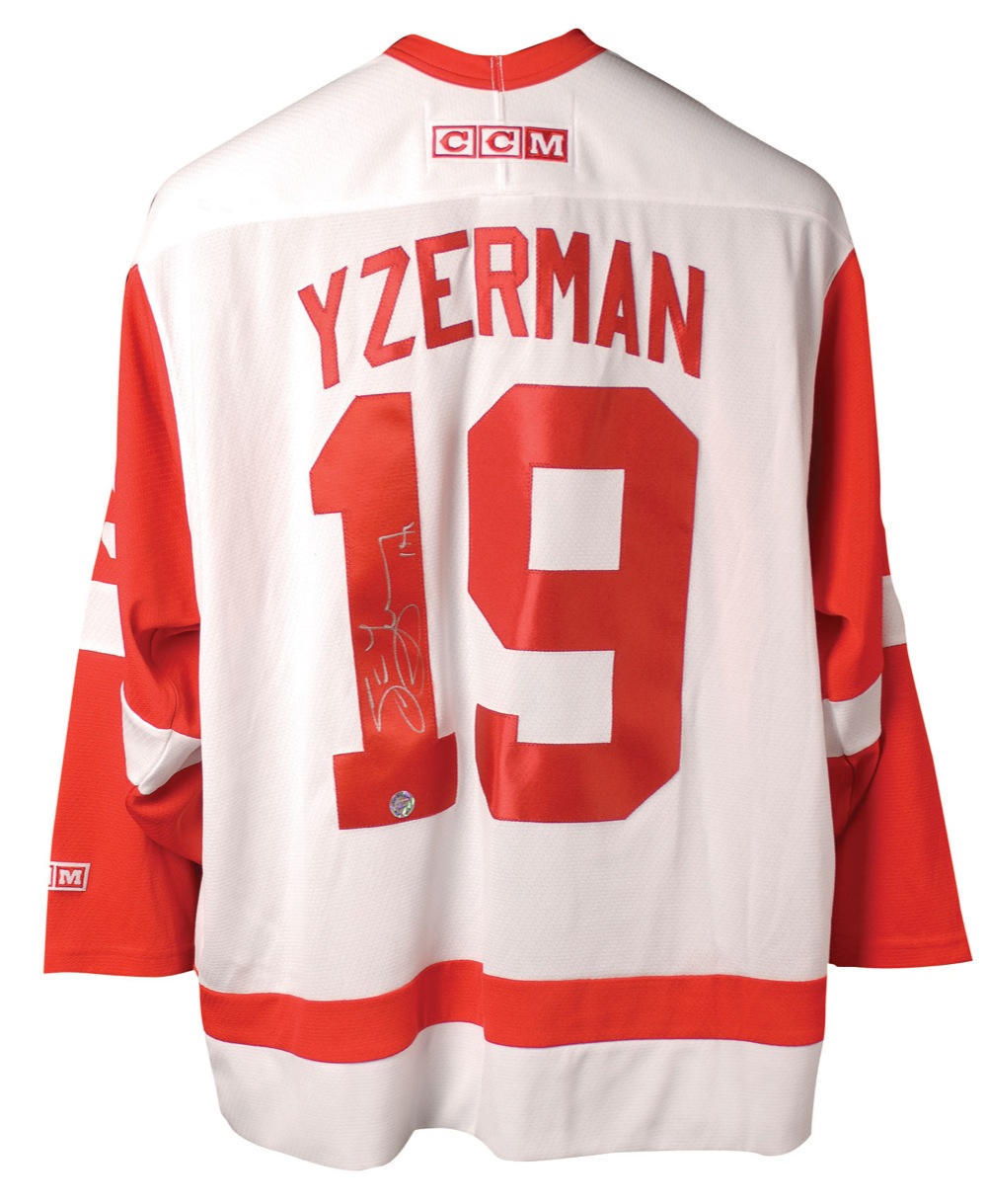 Official CCM replica Detroit Red Wings hockey jersey, with sewn on letters and numbers, signed in silver ink on the number on the back. In fine condition. Pre-certified Steve Grad/PSA/DNA and RR Auction COA.