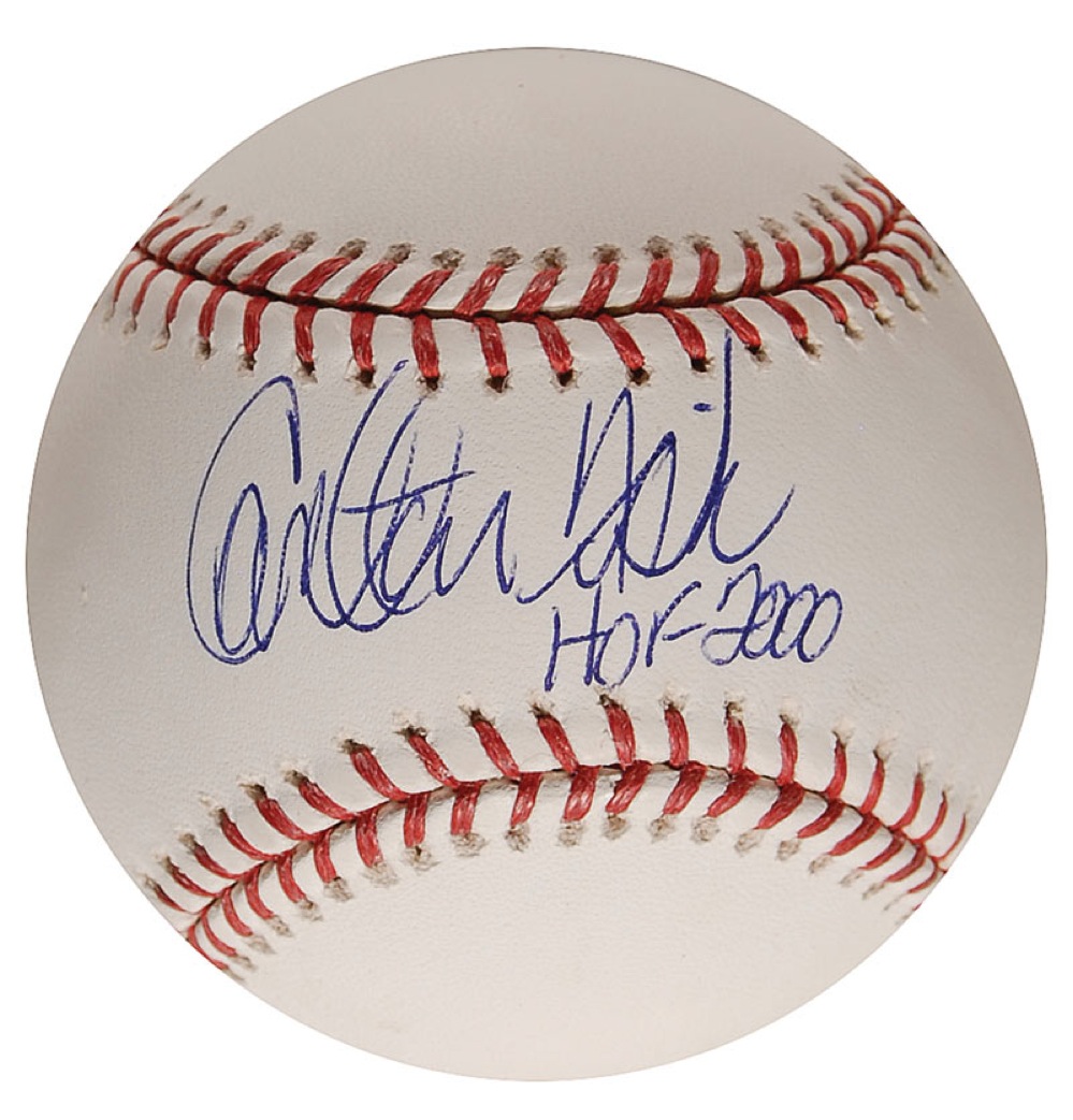 Official Rawlings Major League baseball signed in blue ballpoint on the sweet spot, “Carlton Fisk HOF 2000.” In very fine condition. Accompanied by a certificate of authenticity from PSA/DNA. RRAuction COA.
