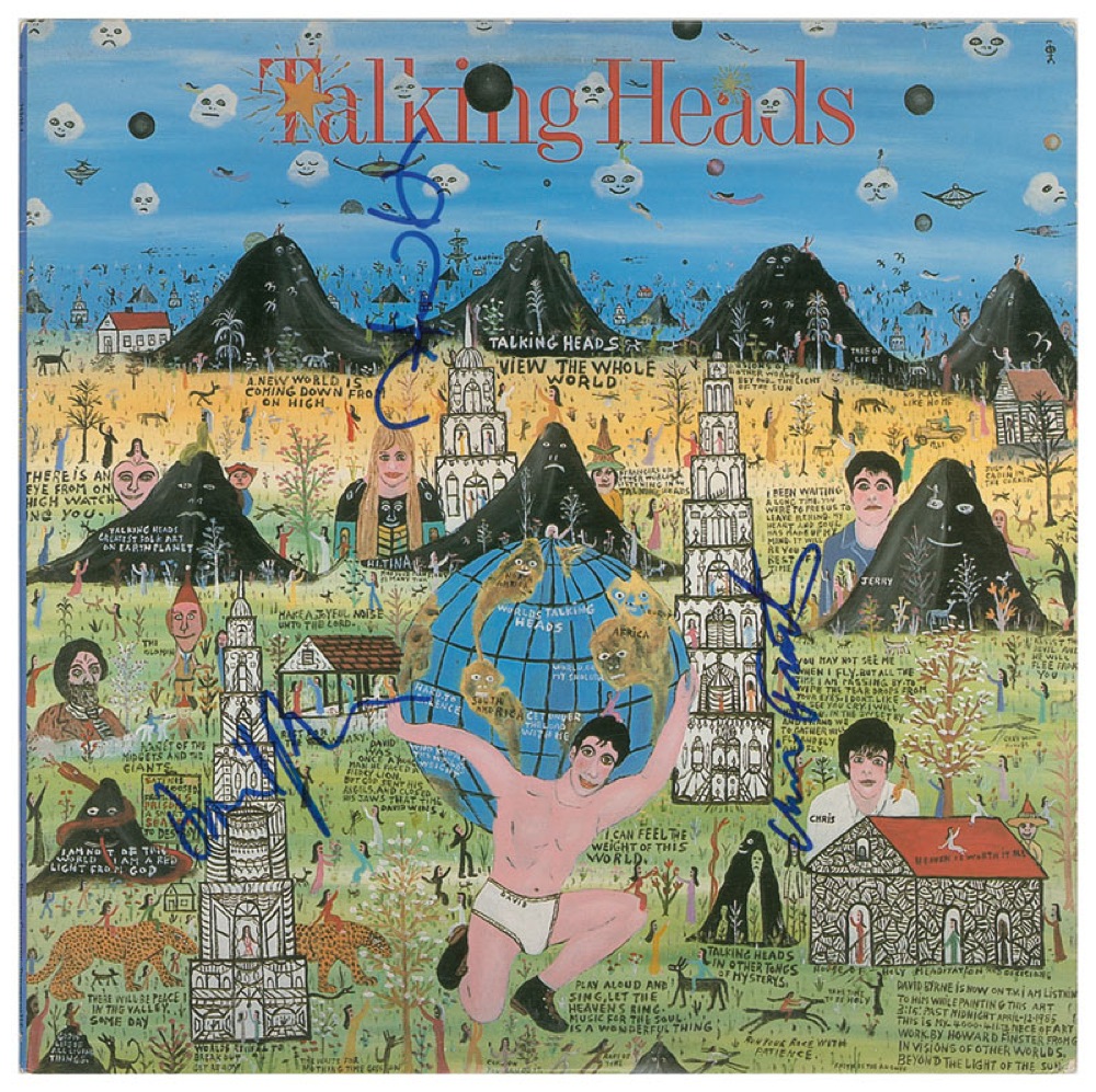 Little Creatures album signed on the front in blue felt tip by David Byrne, Chris Frantz, and Tina Weymouth. In fine condition, with a trivial ‘ring of wear’ to the back cover. The record is included. RRAuction COA.