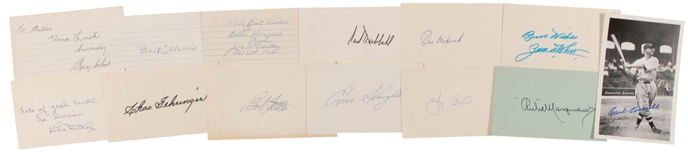 Thirteen items: ink and felt tip signatures of 12 Hall of Famers on individual off-white cards, all approximately 5 x 3, some lined. Signers are: Ray Schalk (ins), Bucky Harris, Joe McCarthy (ins), Carl Hubbell, Joe Medwick, Zack Wheat, Chas. Gehringer, Bob Feller, Enos Slaughter, Yogi Berra, Rube Marquard, and Bill Dickey (ins); and a glossy 3.5 x 5.5 postcard photo of Earl Averill, signed in blue felt tip. In fine overall condition. RRAuction COA.