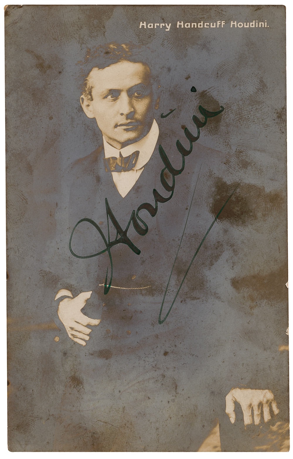 Vintage 3.25 x 5.25 postcard photo of Houdini in a bow tie and three-piece suit, signed in fountain pen, “Houdini.” In very good condition, with moderate to heavy overall silvering, not affecting the large and bold signature. Pre-certified PSA/DNA and RR Auction COA.