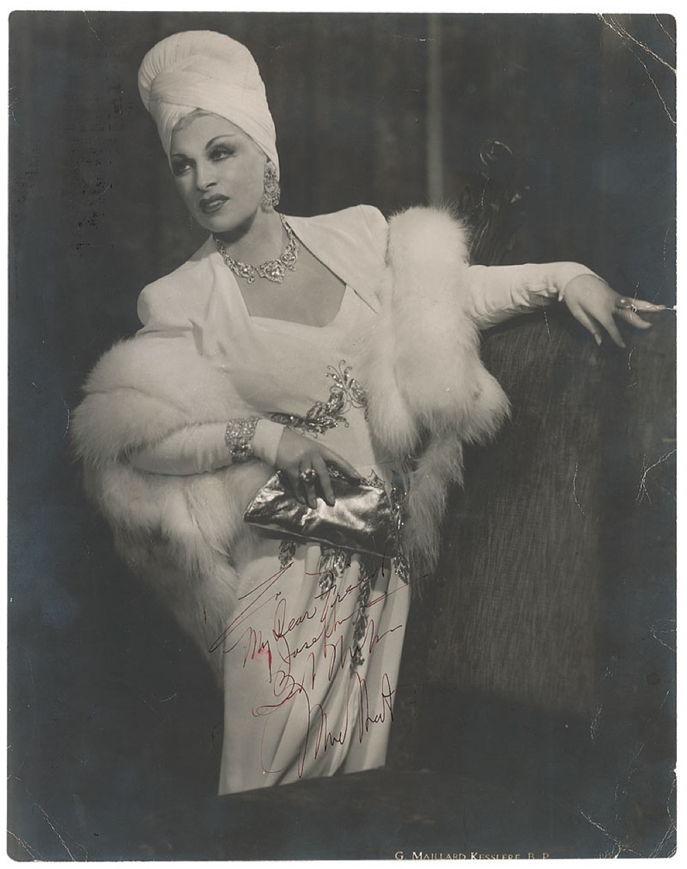 Stunning vintage matte-finish 10.75 x 13.75 three-quarter length Kesslere photo of the actress in diamonds and fur, signed and inscribed in red fountain pen “My Dear Friend Josephine, Best Wishes, Mae West.” In very good condition, with scattered noticeable creasing and light surface marks, a tear to the right edge, scattered silvering to the darker areas of the image, mounting remnants to the reverse, and light brushing to the inscription. Pre-certified PSA/DNA and RR Auction COA.