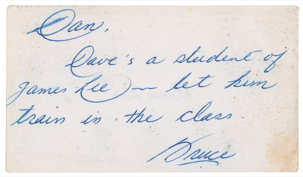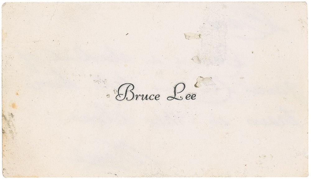 ANS signed “Bruce,” on the reverse of one of his personal business cards 3.5 x 2, no date. Brief note to his top instructor Dan Inosanto, Lee writes, in full: “Dave’s a student of James Lee—let him train [sic] in the class.” In very good condition, with some scattered light toning and soiling, mostly to blank edges, and some toning and light surface loss to reverse. Accompanied by a letter of provenance from James Coburn Jr., son of actor James Coburn. In part, “I, James Coburn JR, state that this Bruce Lee business card was given to my late father James Coburn Senior by the legendary martial arts action star, Bruce Lee. Bruce Lee and my father were close friends and Bruce Lee also trained my father in his art of Jeet Kune Do. On occasion, Bruce Lee gave my father certain materials that reflected what was going on within their friendship, training, or gift related. This signed card was one such item.…Bruce Lee wrote this message on his business card to his top instructor Dan Inosanto, letting him know about a student that trained in Oakland at Bruce Lee’s Gung Fu Institute who wanted to visit the Los Angeles Chinatown school. My father acquired this card from Bruce Lee to bring down to Los Angeles and give it to Dan Inosanto, but my father did not have a chance to meet up with him and kept this card in his possession up until he passed away and then it was turned over to me.” Jun Fan Gung Fu Institute was founded in the Chinatown District of Los Angeles, California, in February 1967 by Lee and Inosanto was appointed head instructor. Lee made only three Senior instructors in his lifetime: Taky Kimura (Seattle), James Lee (Oakland), and Dan Inosanto (Los Angeles). In 1970, Bruce Lee advised Dan Inosanto to “officially” close the doors of the J.F.G.F. Institute, and continue teaching the students in his “backyard gym” in Carson, California. Pre-certified PSA/DNA and RR Auction COA.